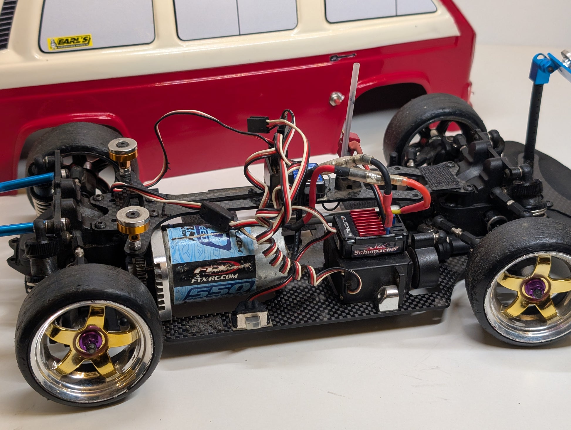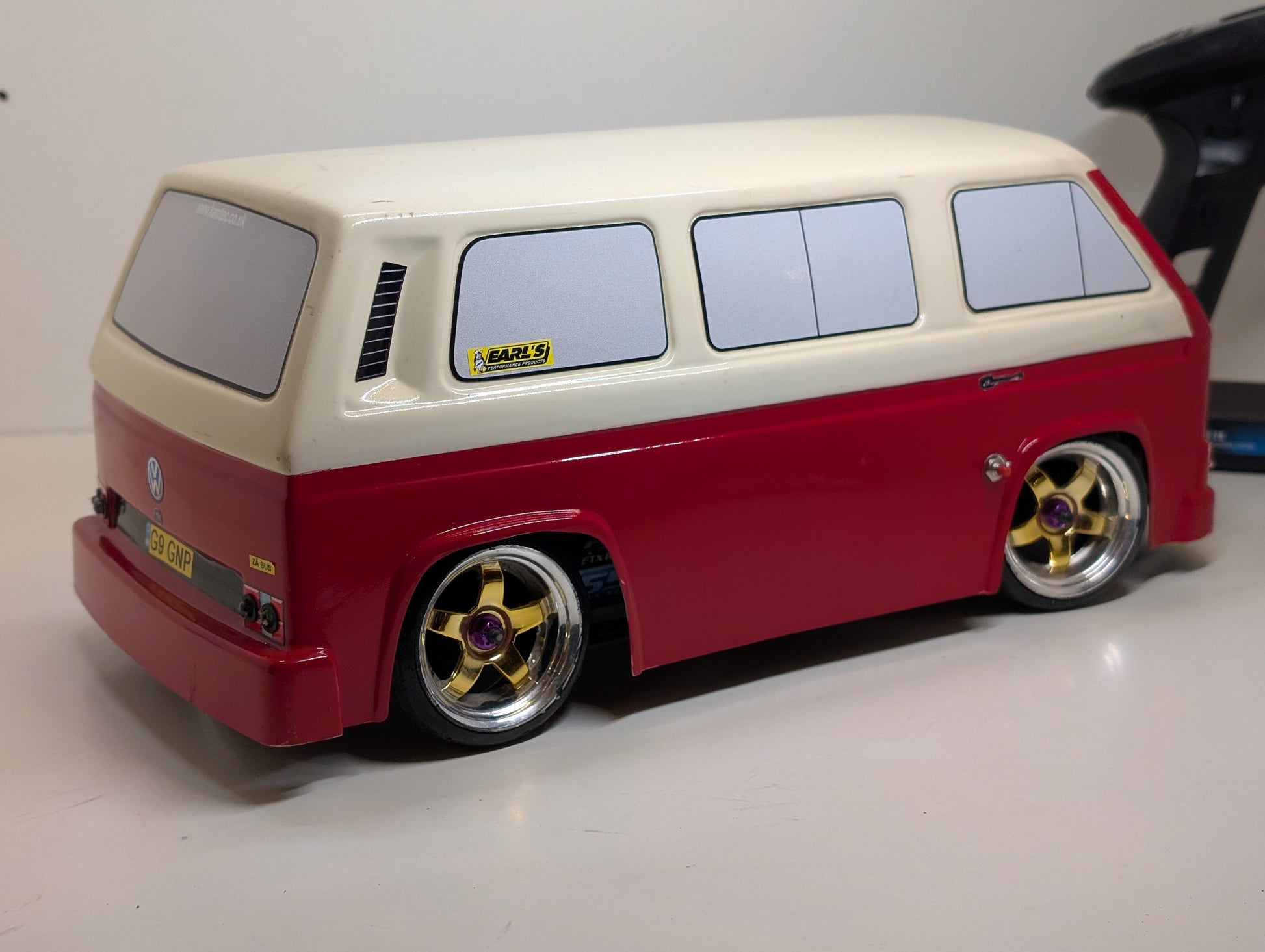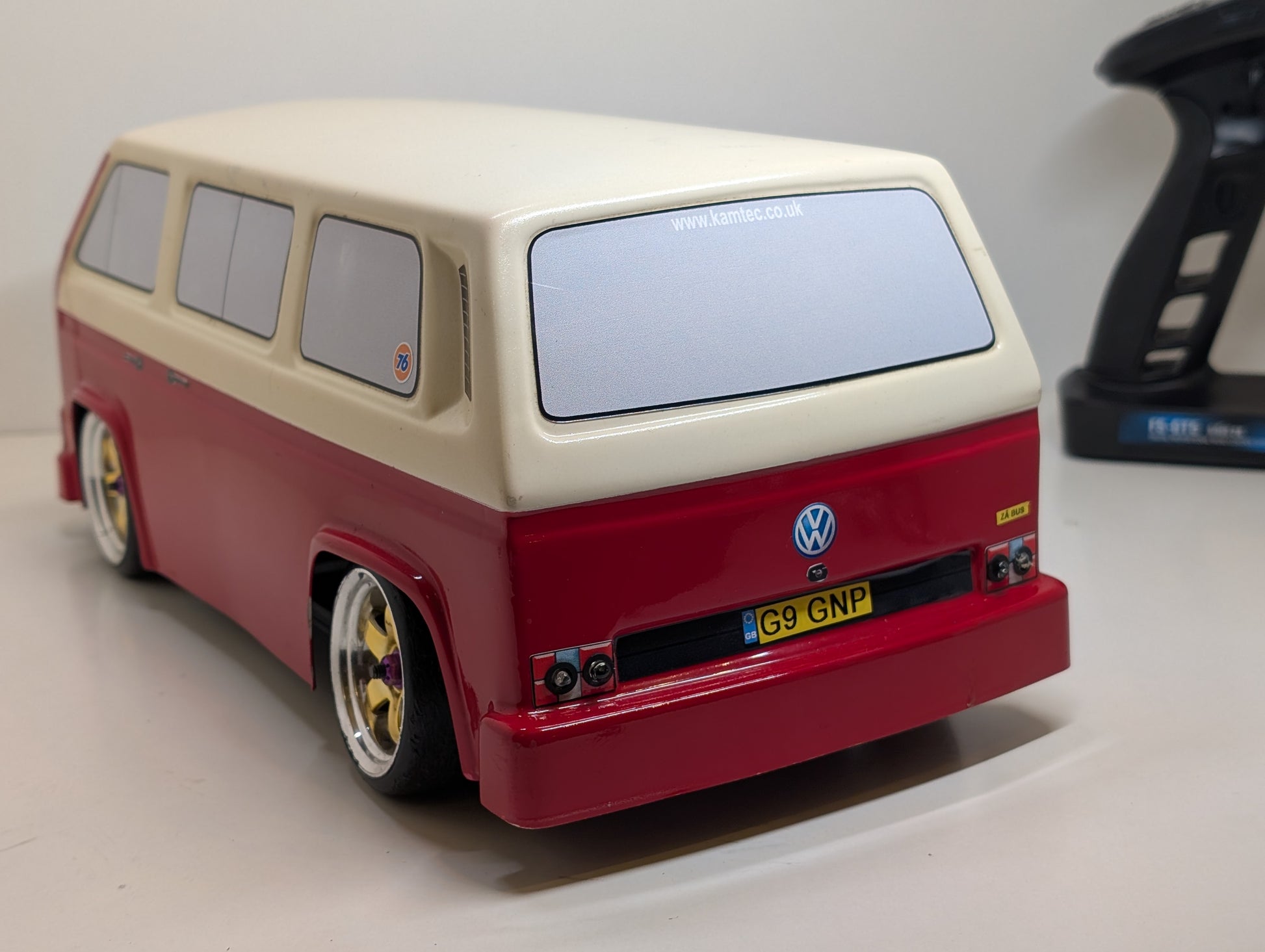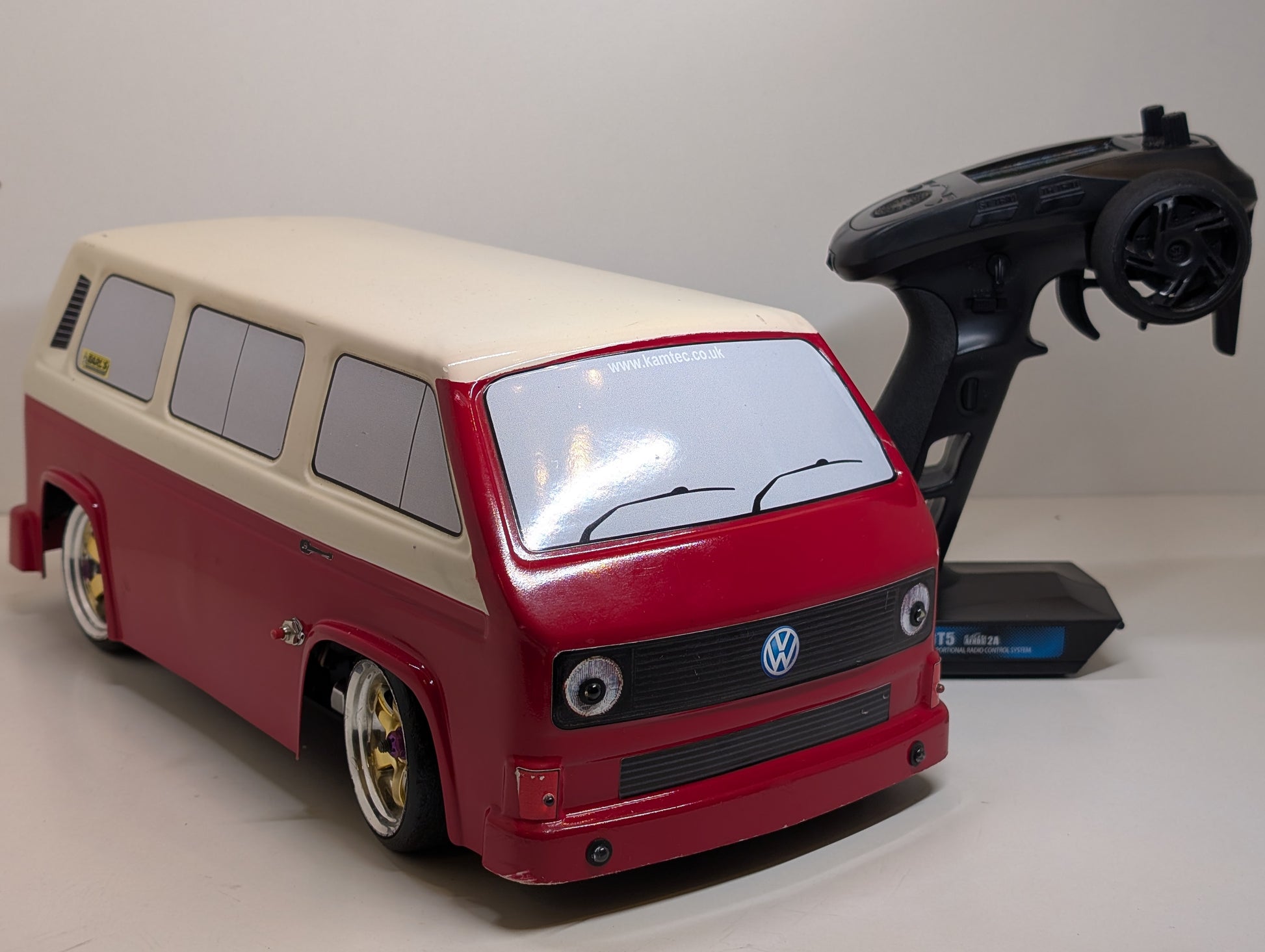 Really fun, currently set up in drift spec, Released in 2015, The M-Rage was a carbon fibre racing chassis conforming to the very popular Tamiya M Chassis racing series. Carbon reinforced gearbox and suspension mounts, diffs and prop shafts, Schumacher Quikrun ESC, FTX 550 Max Speed 15 Turn motor and Full light/indicator ki fitted to the Kamtec VW T25 Camper Body Shell.