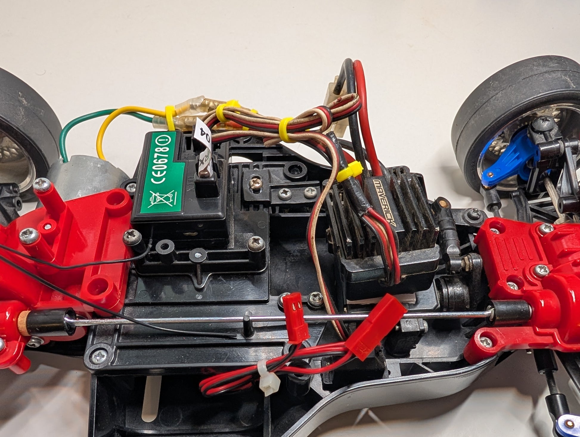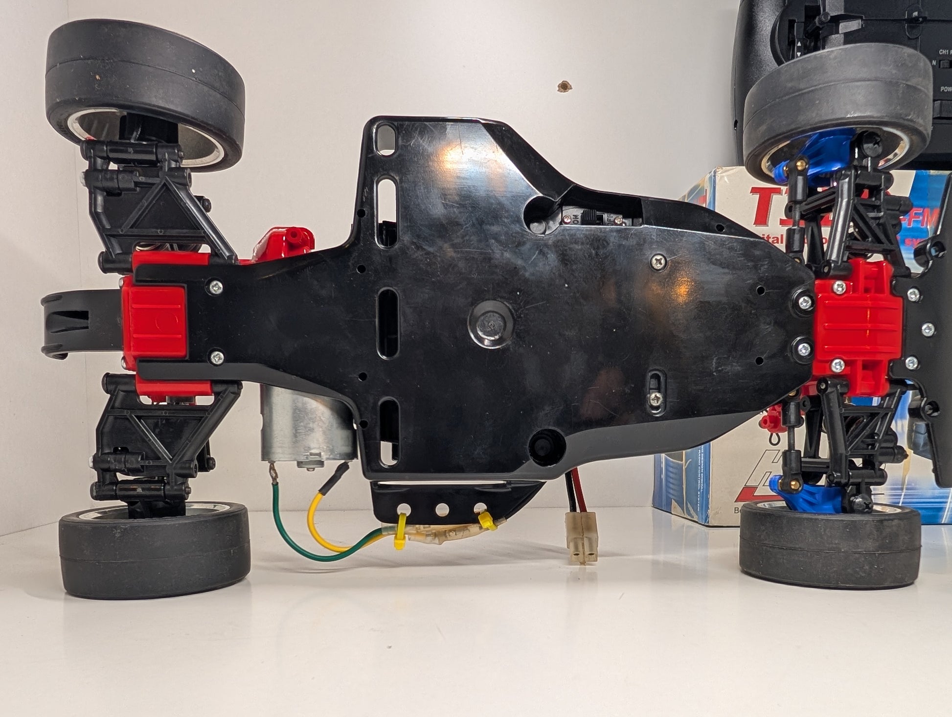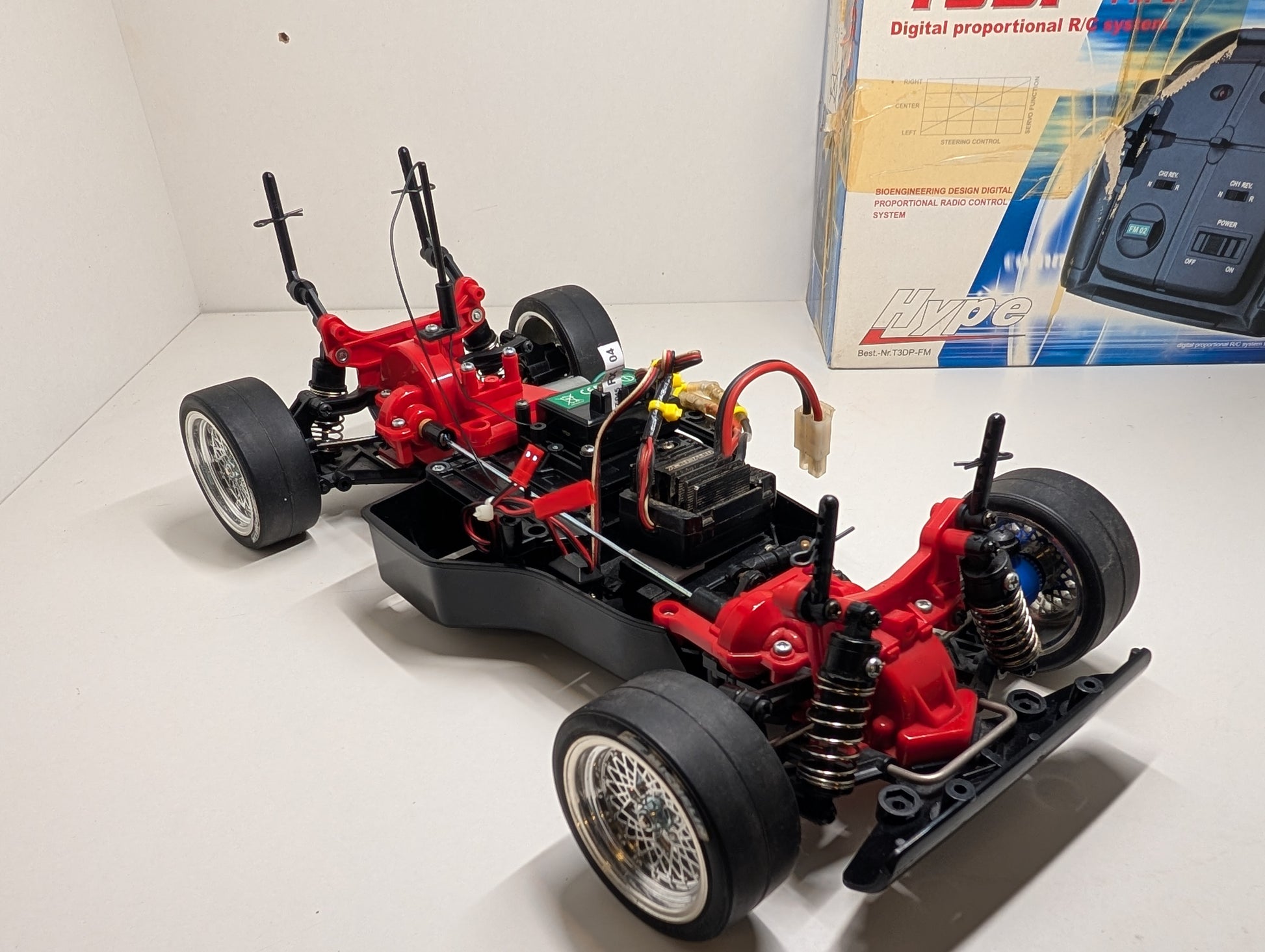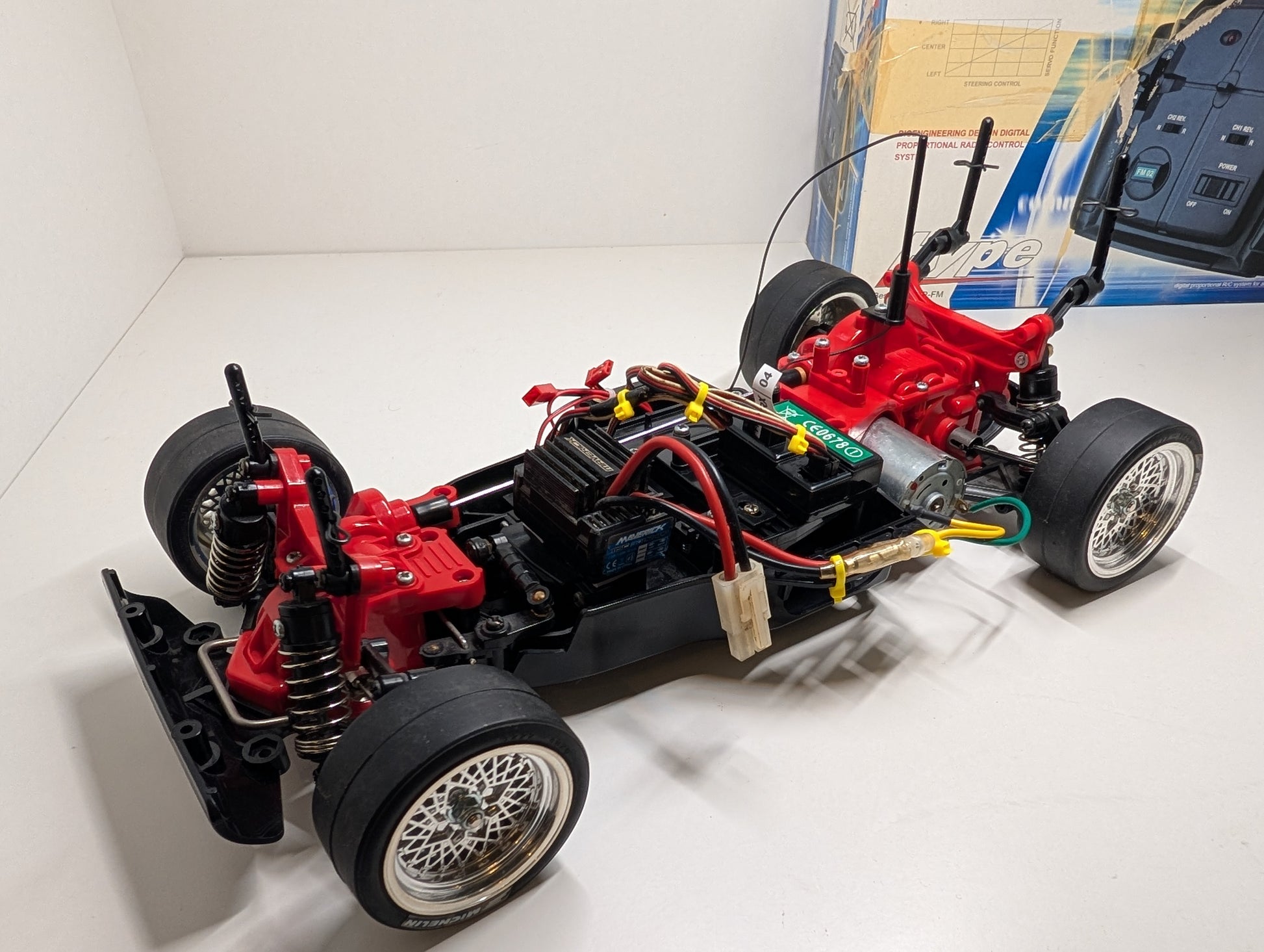Fully Ballraced and absolutely mint Tamiya TA02 Touring Car chassis. Fitted with stock 540 and upgraded Maverick ESC, BBS Wheels and sticky slick tyres. Supplied with L&L models Sierra Cosworth Shell painted in Pearl White. Odd small paint chip or scuff, but it's still in very nice "shelf queen" condition. Complete with 27Mhz receiver installed and matching radio handset, just add a battery and you're ready to race!