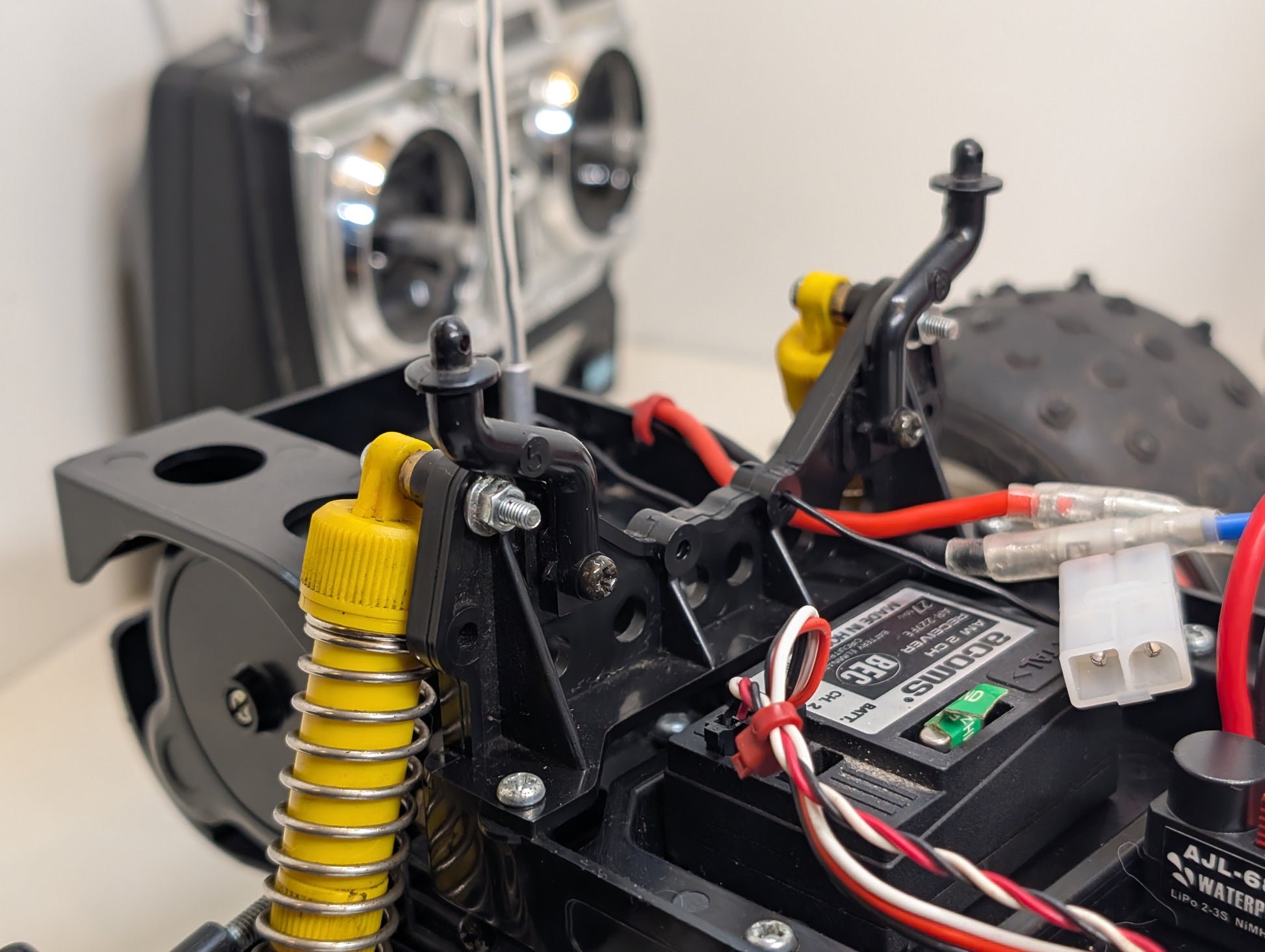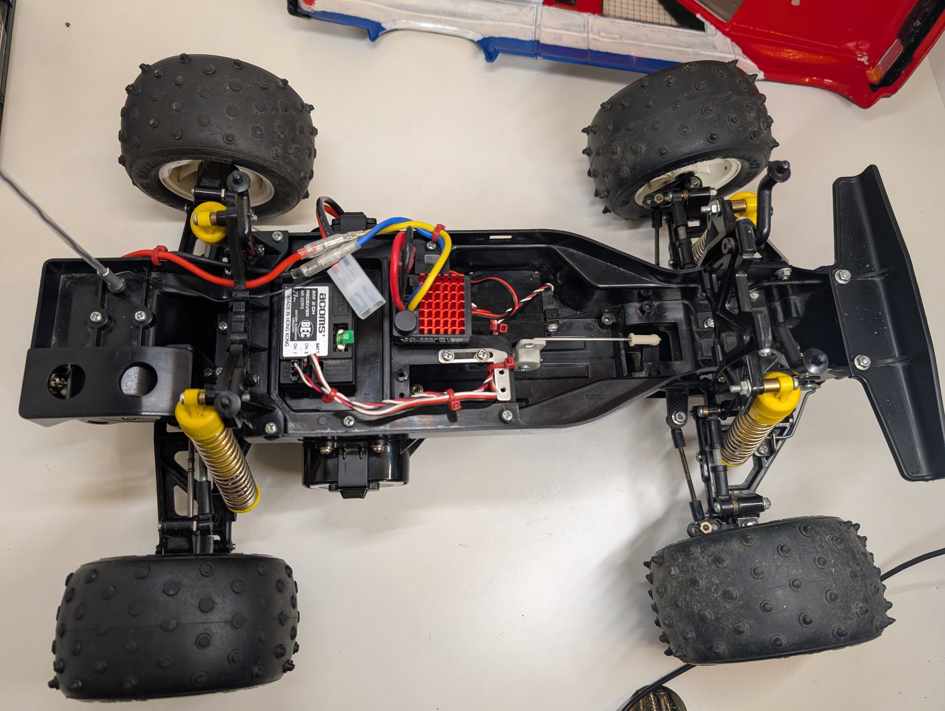 Legendary 1991 Tamiya King Cab with original shell. No splits, cracks or chips on the chassis at all, Avante gearbox mod, updated motor and ESC, absolute wheelie machine if you're brave enough! Tyres are originals, but you'd do well to source a set for running and a set for display as they're really very hard to get hold of, another set of original rims with be included in the price for this purpose.